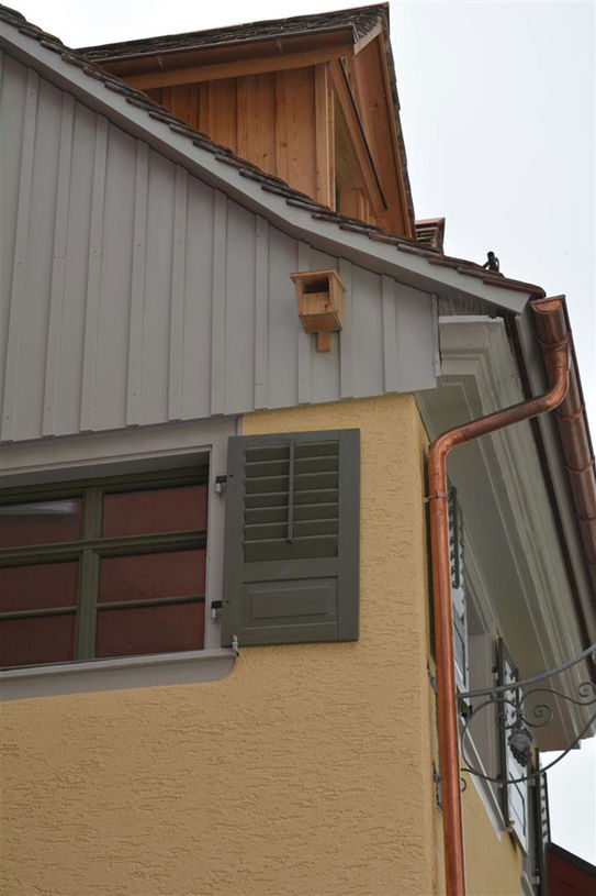 Das instandgesetzte Barockhaus entspricht auch exakt der neuen Meersburger Altstadtsatzung: So sind alle Fenster denkmalkonform, ebenso die Fensterläden. Diese arbeitete man teils auf. Teils wurden sie, dem Vorbild entsprechend, neu angefertigt – ebenso die Haustür. Die Farbgebung, gelber Fassadenanstrich und grüne Fensterläden, entspricht ebenfalls dem historischen Bestand. Auch ein wertvolles Marienbild aus dem 19. Jahrhundert schmückt wieder in voller Schönheit die Hauswand. Die historische Dacheindeckung blieb ebenfalls erhalten. Man verwendete die noch erhaltenen Bestandsziegel und, im rückwärtigen Bereich, die nach ihrem Vorbild gefertigten Biberschwanzziegel „Bodenseebunt“. Die Firma Erlus AG stellt sie exklusiv für Holzbau Schmäh her.